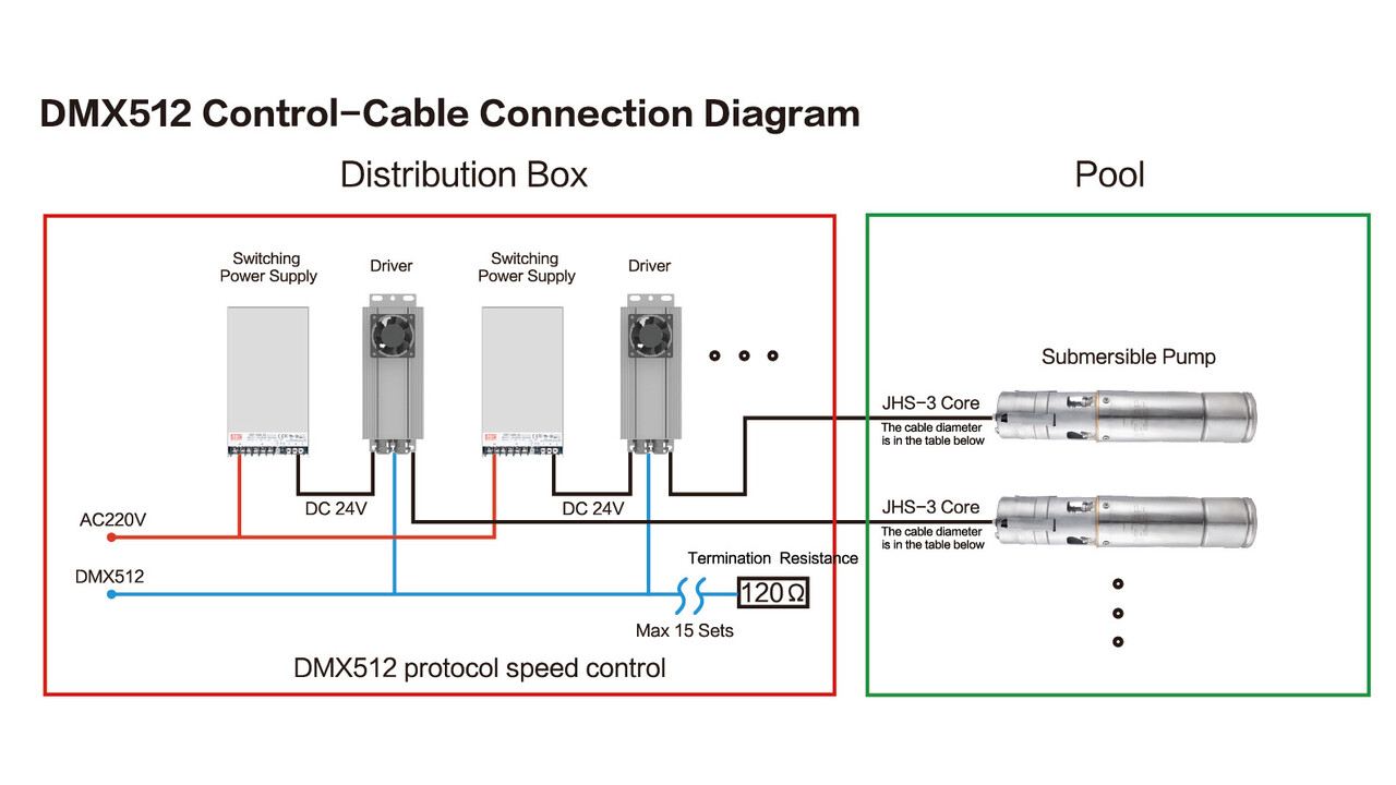 Astral Torpedo DMX подключается к драйверу, который в свою очередь соединен с блоком питания постоянного тока 24–27 В. Драйвер и блок питания монтируются в щите управления, который должен быть на небольшом удалении от фонтана. В зависимости от мощности насоса и расстояния до электрощита необходимо подобрать кабель соответствующего сечения.