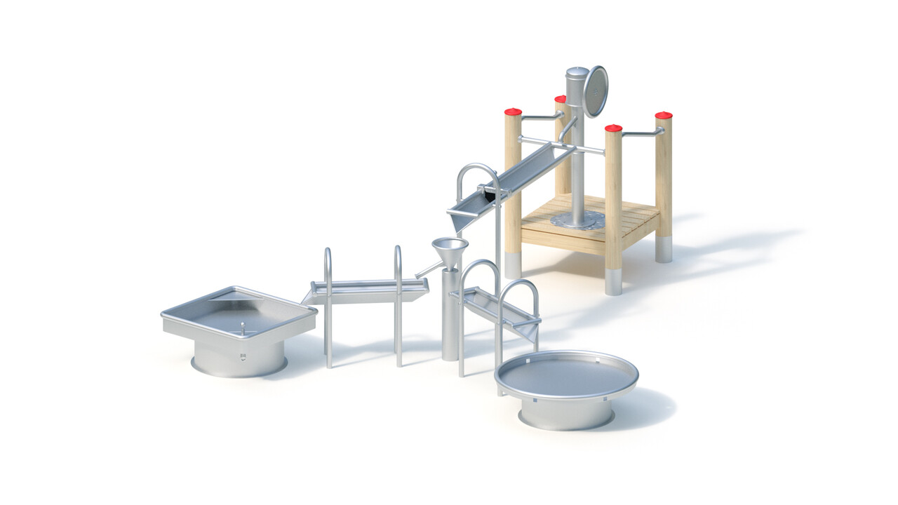 Желоб. Сварная конструкция желоба длиной 1,60 м изготовлена из нержавеющей стали. Толщина листа, из которой выполнен этот элемент водной площадки составляет 2 мм, диаметр трубы кромки 38 мм. Желоб обладает функцией бесступенчатого наклона для установки под необходимым углом для слива воды.