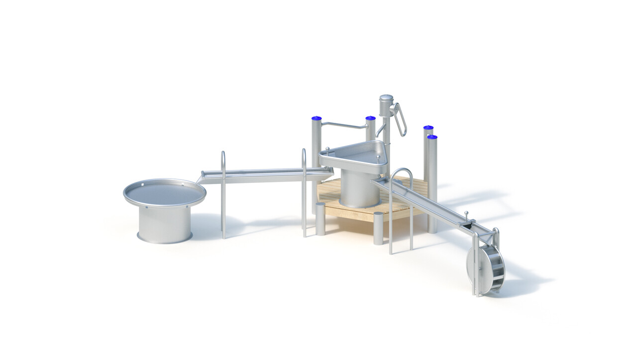 Водяной насос. Водяной насос (арт. № 0-33130-001) высотой 1,17 м для прямого подключения к водопроводу, диаметр присоединения 1¼”, диаметр подающей трубы должен быть не менее ¾”. Конструкция из нержавеющей стали с герметичным корпусом, насосный механизм с роликовыми подшипниками и подшипниками скольжения, верхний корпус насоса с рукояткой. На зимний период необходимо снимать рукоятку, при этом закрывающая крышка для оставшейся нижней части насоса входит в комплект поставки. Насос водной площадки предназначен для установки на твердую поверхность, например, на тумбу или бетонный фундамент. Для подключения водяного насоса к напорному водопроводу требуется доукомплектовать систему вентильным блоком (арт. № 0-33190-000). При этом важно соблюдать рекомендации завода-изготовителя по расстоянию и диаметрам водопроводных линий. Максимальная производительность насоса 0,2 л за одно нажатие рычага, насос позволяет произвести 25 нажатий на рычаг в минуту, при этом расход составит 5 л/мин.