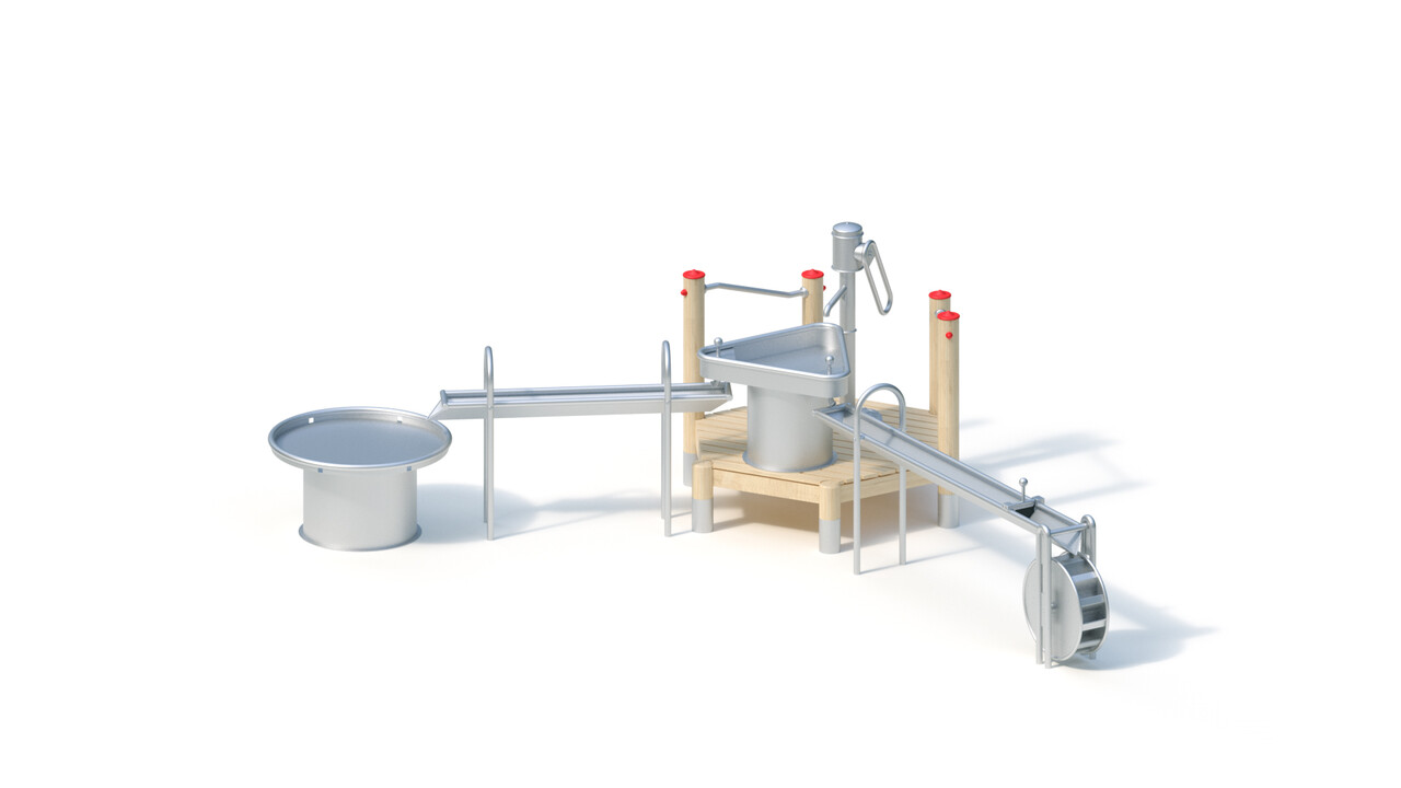 Водяной насос. Водяной насос (арт. № 0-33130-001) высотой 1,17 м для прямого подключения к водопроводу, диаметр присоединения 1¼”, диаметр подающей трубы должен быть не менее ¾”. Конструкция из нержавеющей стали с герметичным корпусом, насосный механизм с роликовыми подшипниками и подшипниками скольжения, верхний корпус насоса с рукояткой. На зимний период необходимо снимать рукоятку, при этом закрывающая крышка для оставшейся нижней части насоса входит в комплект поставки. Насос водной площадки предназначен для установки на твердую поверхность, например, на тумбу или бетонный фундамент. Для подключения водяного насоса к напорному водопроводу требуется доукомплектовать систему вентильным блоком (арт. № 0-33190-000). При этом важно соблюдать рекомендации завода-изготовителя по расстоянию и диаметрам водопроводных линий. Максимальная производительность насоса 0,2 л за одно нажатие рычага, насос позволяет произвести 25 нажатий на рычаг в минуту, при этом расход составит 5 л/мин.