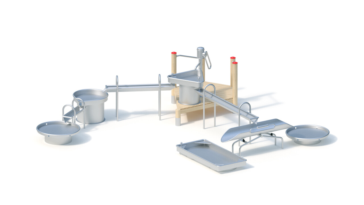 Водяные весы. Сварная конструкция водяных весов (арт. № 0-33495-000) изготовлена из нержавеющей стали. Толщина листа, из которой выполнен этот элемент водной площадки составляет 2,5 мм, диаметр трубы кромки 20 и 38 мм. Лоток обладает регулируемым амортизирующим механизмом наклона для двустороннего распределения воды.