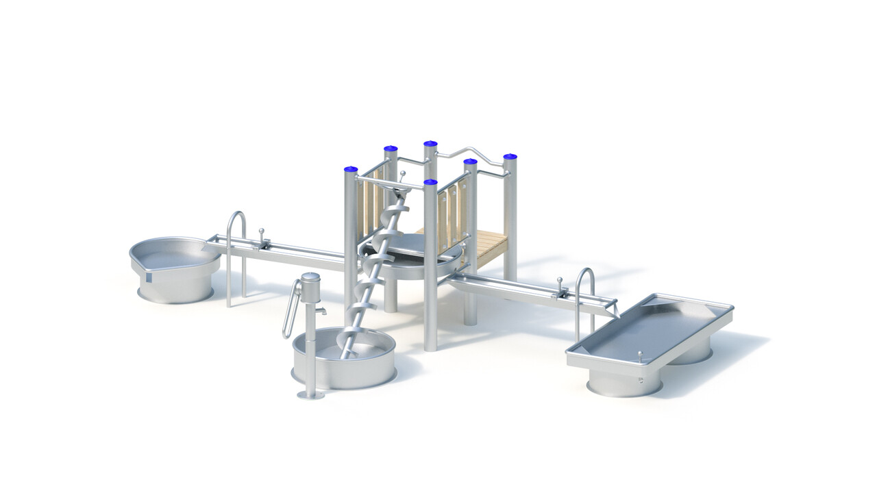 Желоб 1,60 м (2 шт.). Сварная конструкция желоба длиной 1,60 м изготовлена из нержавеющей стали. Толщина листа, из которой выполнен этот элемент водной площадки составляет 2 мм, диаметр трубы кромки 38 мм. Желоб обладает функцией бесступенчатого наклона для установки под необходимым углом для слива воды.