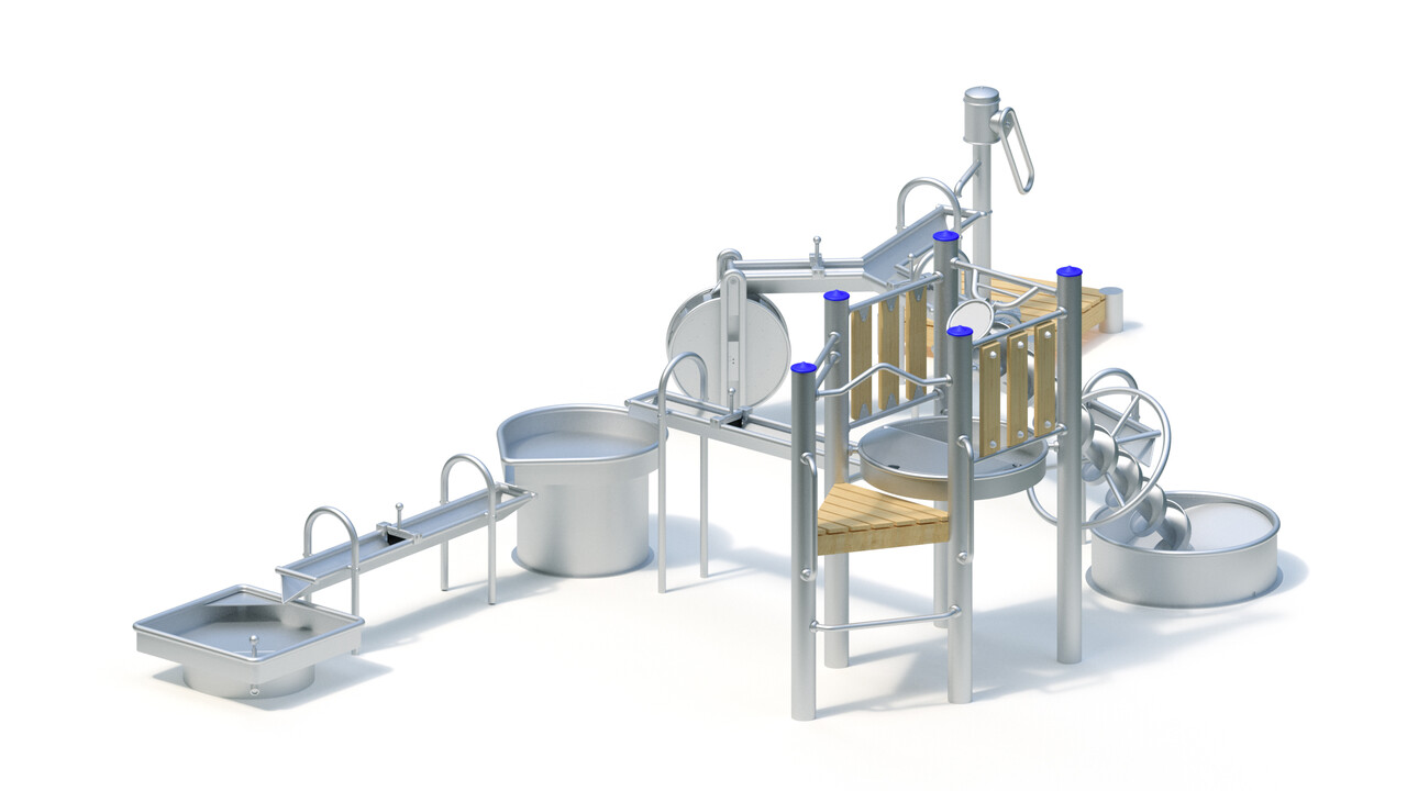 Водяное колесо. Сварная конструкция водяного колеса Ø 0,60 м выполнена из нержавеющей стали. Колесо состоит из 12 закрытых боковыми стенками лопастей и вращается с помощью роликовых подшипников. Толщина листа, из которой выполнен этот элемент водной площадки составляет 2,5 мм, диаметр трубы кромки 38 мм.