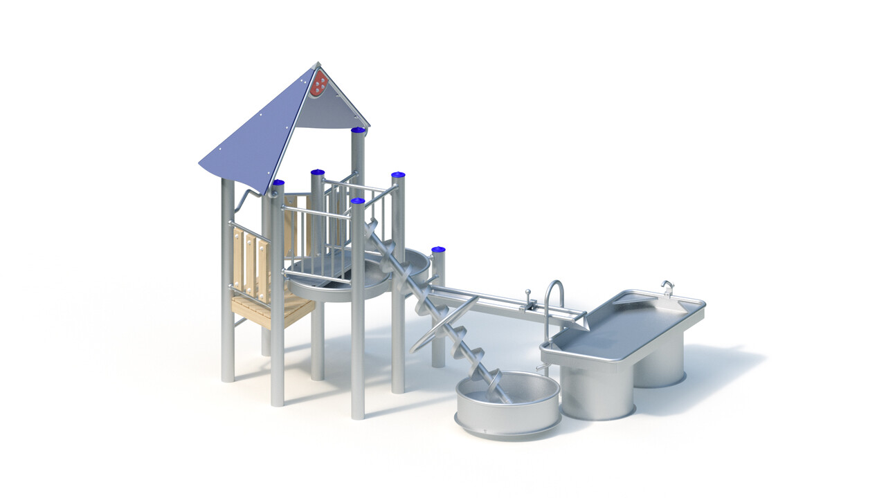 Желоб. Сварная конструкция желоба длиной 1,60 м изготовлена из нержавеющей стали. Толщина листа, из которой выполнен этот элемент водной площадки составляет 2 мм, диаметр трубы кромки 38 мм. Желоб обладает функцией бесступенчатого наклона для установки под необходимым углом для слива воды.
