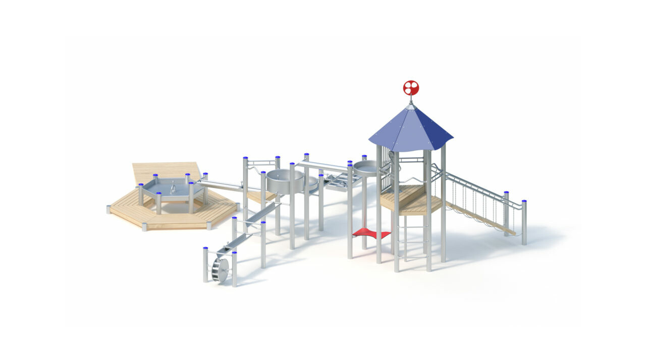 Навесные детали. Качающаяся лестница со ступенями из нержавеющей цепочки размером 0,80 м x 2,40 м закреплена на бревнах из акации Ø 10 см, перила выполнены и ограждения выполнены из нержавеющей стали. Пандус 2,40 м х 1,60 м с уклоном 0,10 м из профильных досок 95 х 30 мм. Балочные и двойные перила, а также стабилизаторы поперечной устойчивости выполнены из нержавеющей трубы Ø33,7 x 2,0 мм. Подъемные изогнутые ступени из нержавеющей трубы Ø 33,7 мм. Вертикальные ручки для помощи при лазании из нержавеющей стали выполнены из трубы Ø33,7 x 2 мм и надежно закреплены на стойках. Решетчатый парапет из нержавеющей трубы 25 х 2мм закреплен между трубами из нержавеющей стали Ø 33,7 х 2 мм. Столик красного цвета размером 0,80 x 0,80 м, изготовлен из цветного устойчивого к атмосферным воздействиям ламината HPL, 15 мм. Тентовая крыша 6 x 0,80 м с углом наклона 45° изготовлена из устойчивого к атмосферным воздействиям HPL-пластика (цвет - синий). HPL-панели толщиной 13 мм закреплены к каркасу крыши из нержавеющей трубы Ø33,7 x 2 мм.