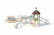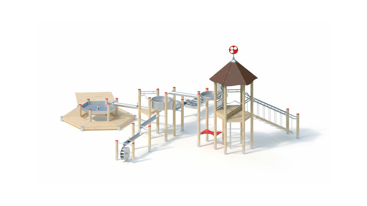 Навесные детали. Качающаяся лестница со ступенями из нержавеющей цепочки размером 0,80 м x 2,40 м закреплена на бревнах из акации Ø 10 см, перила выполнены и ограждения выполнены из нержавеющей стали. Пандус 2,40 м х 1,60 м с уклоном 0,10 м из профильных досок 95 х 30 мм. Балочные и двойные перила, а также стабилизаторы поперечной устойчивости выполнены из нержавеющей трубы Ø33,7 x 2,0 мм. Подъемные изогнутые ступени из нержавеющей трубы Ø 33,7 мм. Вертикальные ручки для помощи при лазании из нержавеющей стали выполнены из трубы Ø33,7 x 2 мм и надежно закреплены на стойках. Решетчатый парапет из нержавеющей трубы 25 х 2мм закреплен между трубами из нержавеющей стали Ø 33,7 х 2 мм. Столик красного цвета размером 0,80 x 0,80 м, изготовлен из цветного устойчивого к атмосферным воздействиям ламината HPL, 15 мм. Тентовая крыша 6 x 0,80 м с углом наклона 45° изготовлена из устойчивого к атмосферным воздействиям HPL-пластика (цвет - коричневый). HPL-панели толщиной 13 мм закреплены к каркасу крыши из нержавеющей трубы Ø33,7 x 2 мм.