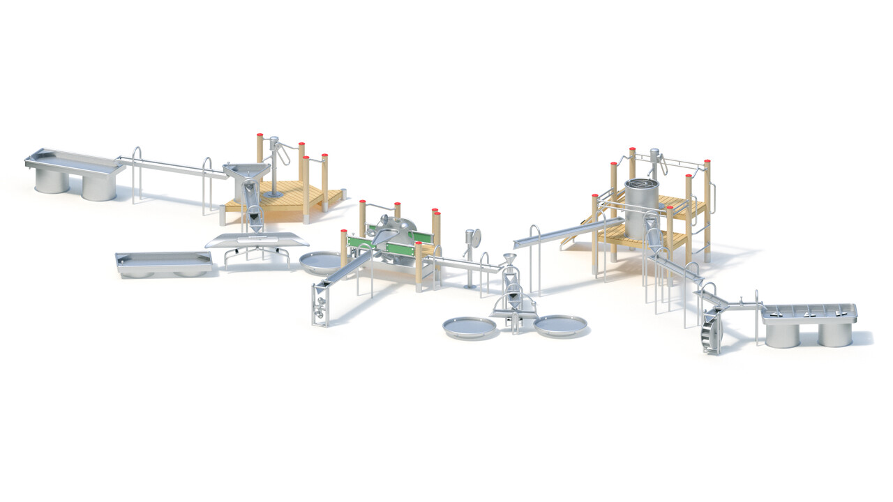 Водяная мельница. Конструкция водяной мельницы выполнена из сварной нержавеющей стали. Сверху элемента водной площадки расположена воронка, под ней 6 чашек, вращающихся на колесе с роликовыми подшипниками.
