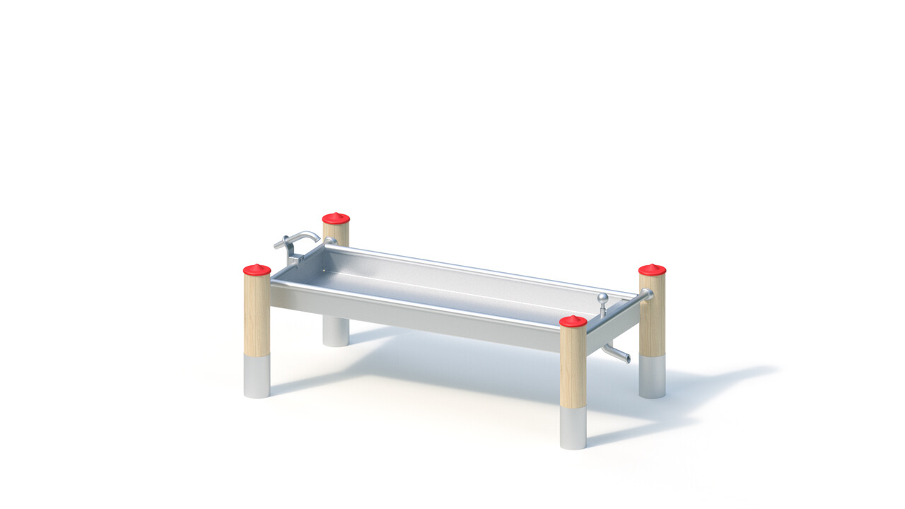 Компоненты. Сварная конструкция стола размером 0,80 х 1,60 м с 1 сливной трубой изготовлена из нержавеющей стали. Толщина листа, из которой выполнен этот элемент водной площадки составляет 2 мм, диаметр трубы кромки 33,7 мм. Труба для слива воды имеет резиновый конус и замком для полного удаления воды.