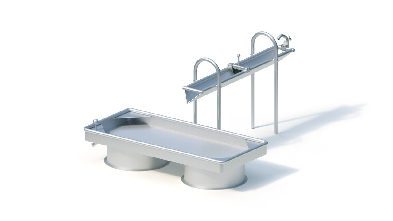 Желоб. Сварная конструкция желоба длиной 1,60 м изготовлена из нержавеющей стали. Толщина листа, из которой выполнен этот элемент водной площадки составляет 2 мм, диаметр трубы кромки 38 мм. Желоб обладает функцией бесступенчатого наклона для установки под необходимым углом для слива воды.