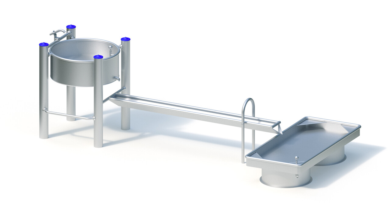 Желоб. Сварная конструкция желоба длиной 2,40 м изготовлена из нержавеющей стали. Толщина листа, из которой выполнен этот элемент водной площадки составляет 2 мм, диаметр трубы кромки 38 мм. Желоб обладает функцией бесступенчатого наклона для установки под необходимым углом для слива воды.