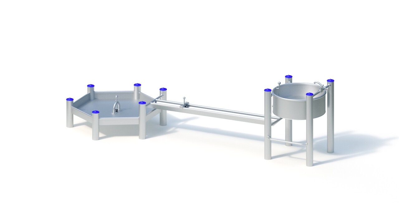 Желоб. Сварная конструкция желоба длиной 2,40 м изготовлена из нержавеющей стали. Толщина листа, из которой выполнен этот элемент водной площадки составляет 2 мм, диаметр трубы кромки 38 мм. Желоб обладает функцией бесступенчатого наклона для установки под необходимым углом для слива воды.