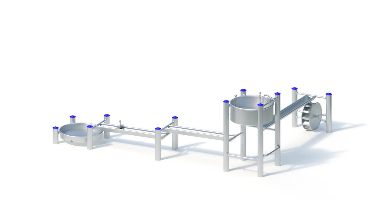 Желоб 1,60 м (2 шт.). Сварная конструкция желоба длиной 1,60 м изготовлена из нержавеющей стали. Толщина листа, из которой выполнен этот элемент водной площадки составляет 2 мм, диаметр трубы кромки 38 мм. Желоб обладает функцией бесступенчатого наклона для установки под необходимым углом для слива воды.
