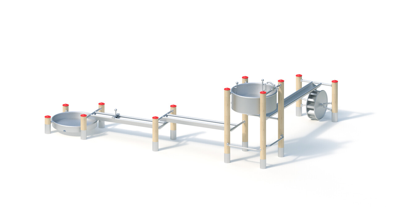 Водяное колесо. Сварная конструкция водяного колеса Ø 0,60 м выполнена из нержавеющей стали. Колесо состоит из 12 закрытых боковыми стенками лопастей и вращается с помощью роликовых подшипников. Толщина листа, из которой выполнен этот элемент водной площадки составляет 2,5 мм, диаметр трубы кромки 38 мм.