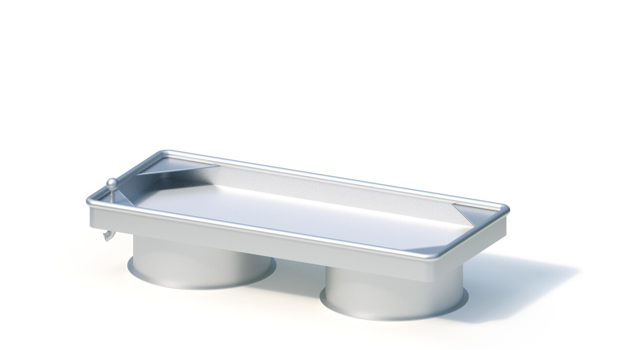 Сварная конструкция стола с 1 сливной трубой изготовлена из нержавеющей стали. Толщина листа, из которой выполнен этот элемент водной площадки составляет 2,0 мм, диаметр трубы кромки 38 мм. Труба для слива воды имеет резиновый конус и замком для полного удаления воды. В углах стола расположены 4 полки.