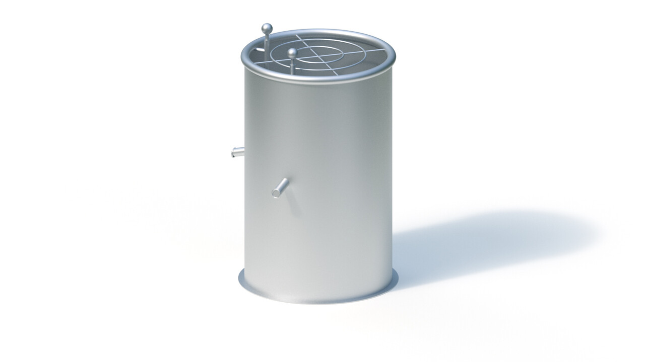 Сварная конструкция резервуара с 2 сливными трубами изготовлена из нержавеющей стали. Толщина листа, из которой выполнен этот элемент водной площадки составляет 2 мм, диаметр трубы кромки 38 мм. Верхняя решетка служит защитой от проникновения внутрь людей. Резиновый конус с замком предназначен для полного удаления воды из резервуара. Крепление основания происходит с помощью анкеров нижнего фланцевого кольца. Объем воды резервуара составляет 140 л.