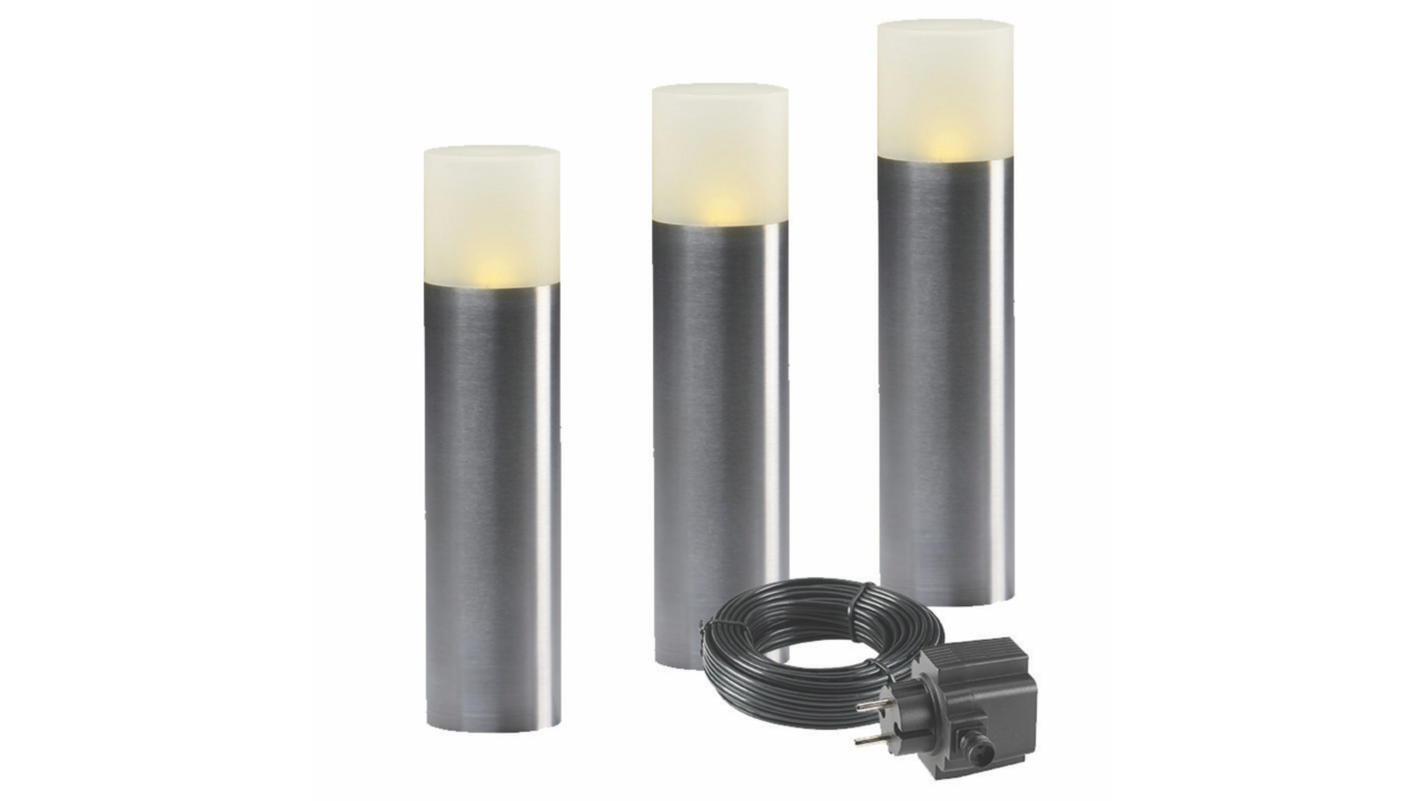 Комплект из трех светильников Oak Set - отличные, легкие столбики из нержавеющей стали. Комплект можно использовать только в помещении. Наш комплект включает в себя трансформатор.