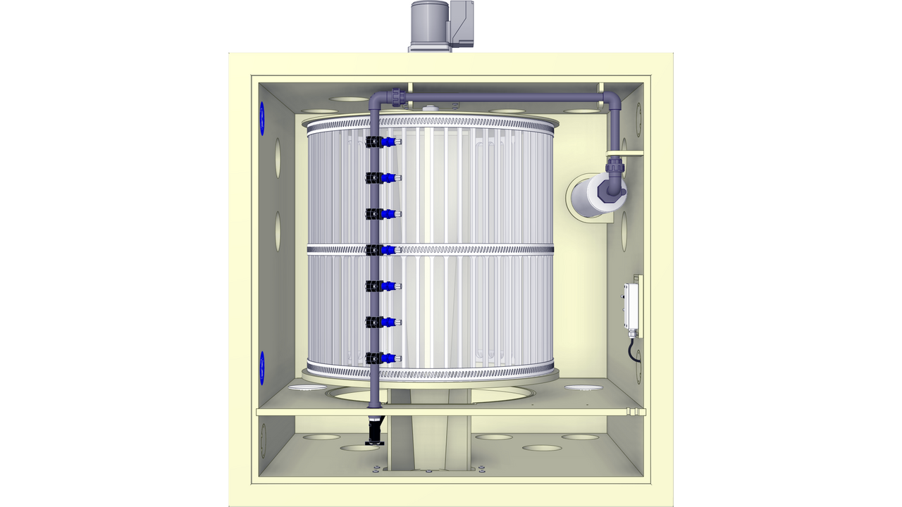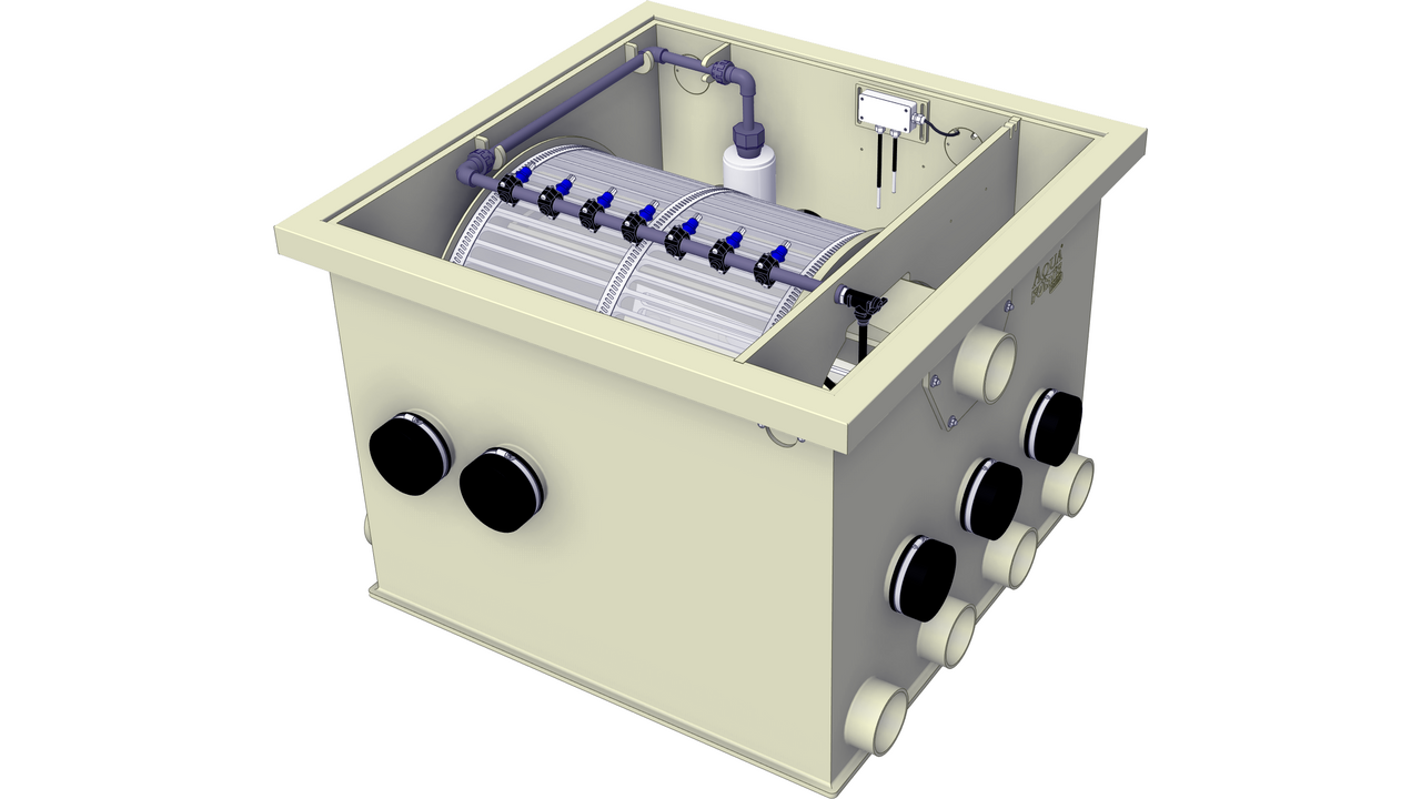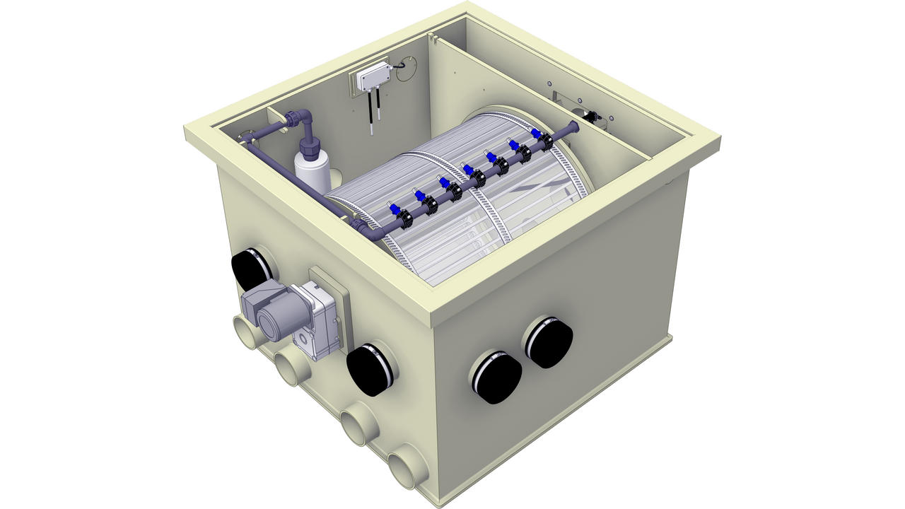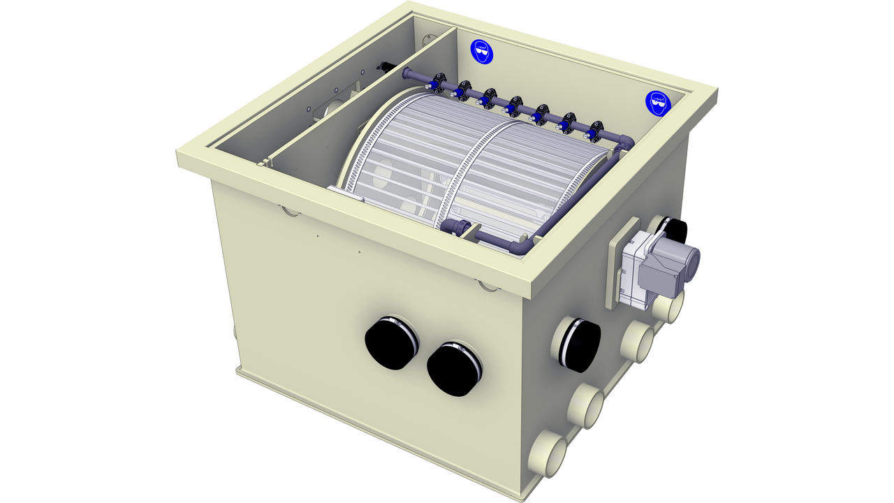 Фильтр оснащен мощным промывочным насосом мощностью 600Вт из нержавеющей стали с давлением 5 бар и функцией дополнительной промывка желоба. Промывку желоба можно производить вручную с помощью регулировочного крана. Барабан укомплектован фильтрующей сеткой из нержавеющей стали с ячейкой 120 микрон, т.е. частицы грязи размером более 0,12 мм не могут проходить через сетку. Такая сетка обеспечивает хороший поток и может снабжать последующую биокамеру необходимым количеством углерода, что при более тонкой фильтрация (< 80 микрон) бывает недостаточно.