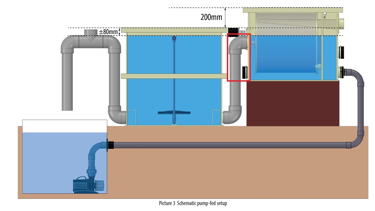Фильтр оснащен мощным промывочным насосом мощностью 600Вт из нержавеющей стали с давлением 5 бар и функцией дополнительной промывка желоба. Промывку желоба можно производить вручную с помощью регулировочного крана. Барабан укомплектован фильтрующей сеткой из нержавеющей стали с ячейкой 120 микрон, т.е. частицы грязи размером более 0,12 мм не могут проходить через сетку. Такая сетка обеспечивает хороший поток и может снабжать последующую биокамеру необходимым количеством углерода, что при более тонкой фильтрация (< 80 микрон) бывает недостаточно.