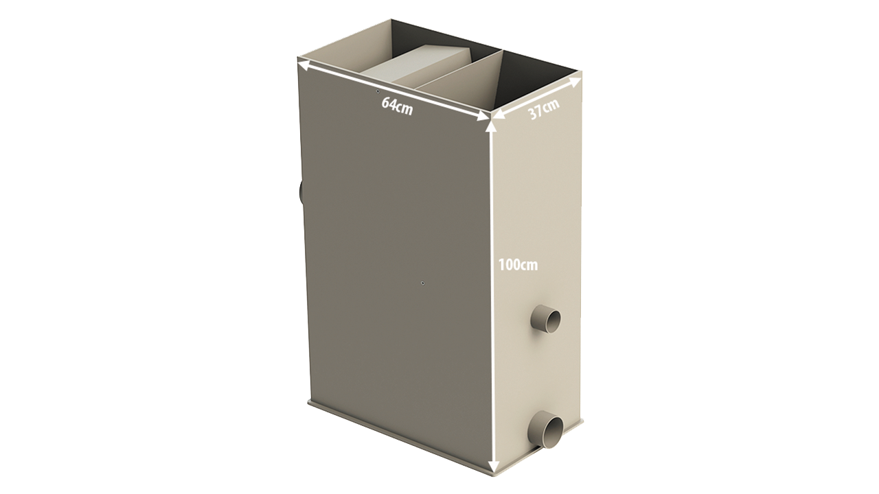 Фильтр данной модели представляет собой более простую версию гравитационного сетчатого фильтра для пруда предварительной очистки. Фильтрация воды осуществляется через изогнутую нержавеющую сетку. При запуске системы, грязная прудовая вода поступает через входные отверстия фильтра в верхнюю камеру, далее через заслонку падает на сетку. Заслонка соединена с поплавковым механизмом, который контролирует уровень воды в гравитационном фильтре. Находящиеся в воде частички грязи или водоросли, например нитевидные, остаются на сетке, а таким образом отфильтрованная воды попадает в нижнюю камеру. Далее насос, подключенный к префильтру забирает воду и под давлением подает, например, на напорный бусиничный фильтр.