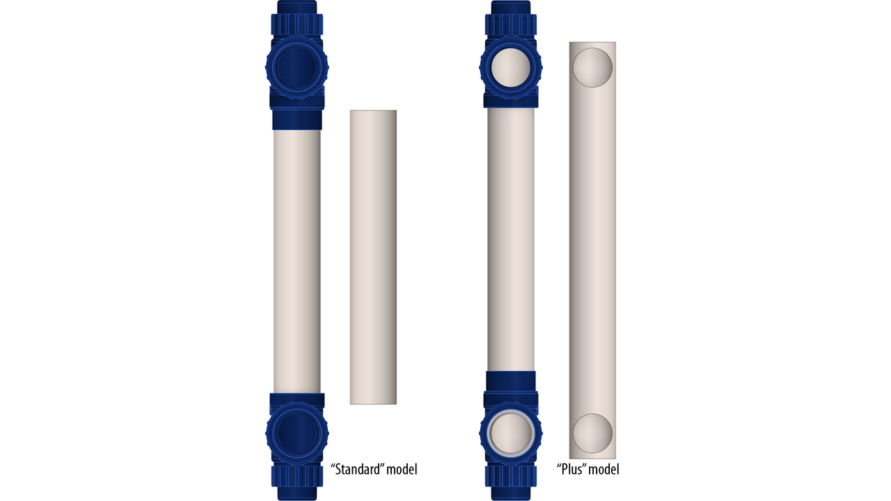 Внутренняя часть Power Midi Plus T5 полностью изготовлена из нержавеющей стали. В предыдущей версии Power Midi нержавеющая труба заканчивалась на пластиковых соединениях. В новых моделях Plus эта труба проходит внутрь пластиковых деталей и снабжена отверстиями для поступления воды. Такое изменение в конструкции сделано для защиты пластиковых компонентов УФ-излучателя от разрушительного воздействия ультрафиолета.