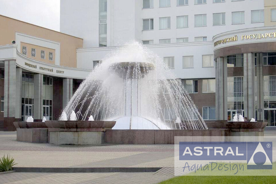 Цветомузыкальный фонтан с пенными столбами и рядом одиночных струй украшает главный вход Белгородского государственного университета. Наши специалисты разработали проект и обеспечили своевременную поставку оборудования.