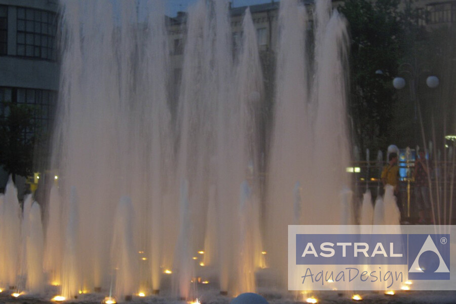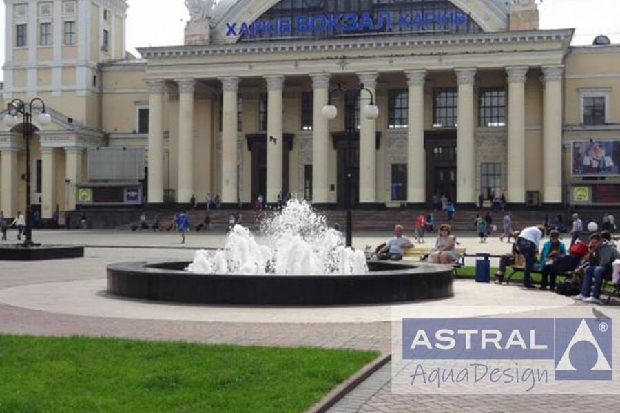 Цветомузыкальный фонтан был построен рядом с вокзалом Харьков-южный. По всему периметру установлены 12 насадок образующие пенные столбы различной высоты. Хотя такие струи практически не разбрызгиваются при ветре, при создании проекта, мы предусмотрели установку системы понижающей высоту водных столбов.