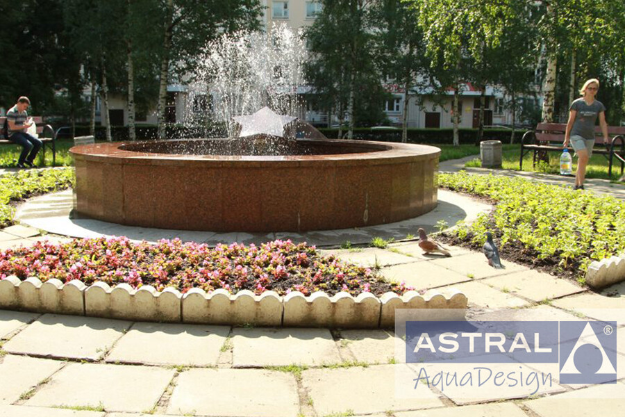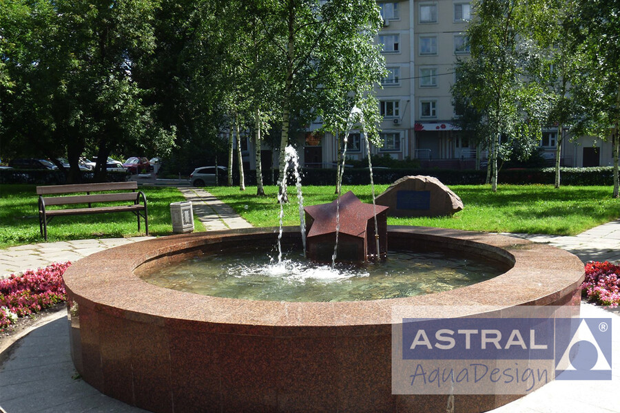 Уютный московский сквер им.Талалихина, украсил небольшой фонтан, облицованный материалом напоминающим мрамор. Его построили к 60-й годовщине Победы. На скульптуре в виде звезды, расположенной в центре круглой чаши, нанесены годы Великой отечественной войны. Ведь прославляя подвиг героев, нужно всегда помнить и трудные годы нашей истории. Водная композиция лаконичная - ее создают три многоструйные веерные насадки подсвеченные RGB светильниками.