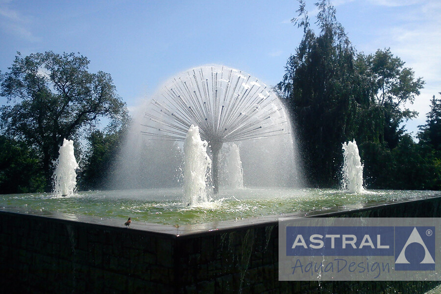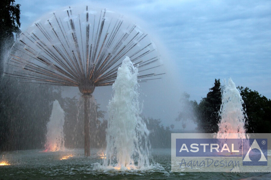 Прямоугольную чашу цветодинамического фонтана размером 30х15 метров украшает насадка полусфера, ее дополняют четыре пенные струи. Этот фонтан стал один из многих построенных при непосредственном участии наших сотрудников.