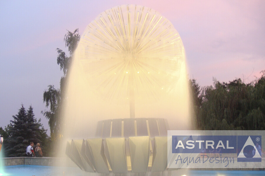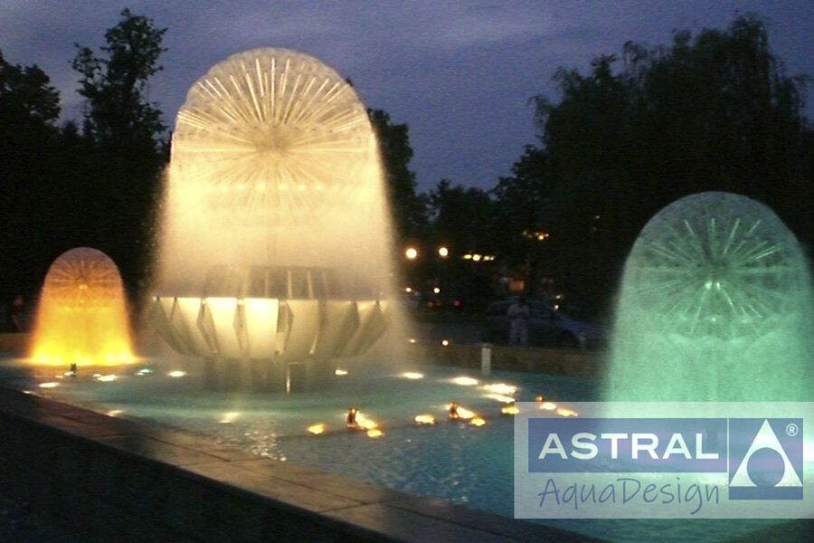 Фонтан с тремя сферическими насадками установленными в чаше 15х7 метров построили наши специалисты в парке Липецка. Шесть пенных насадок отделяют центральную часть композиции от боковых. Подсветка сфер и пенных столбов создана при помощи ярких светильников. Благодаря тому, что насадки выполнены из нержавеющей стали они выглядят стильно и будут служить долгие годы.