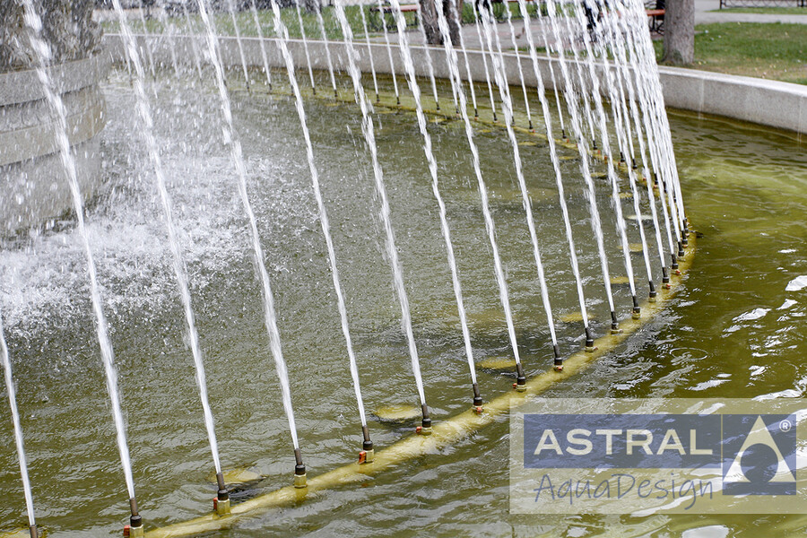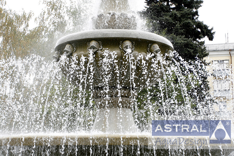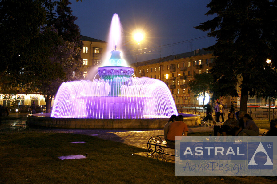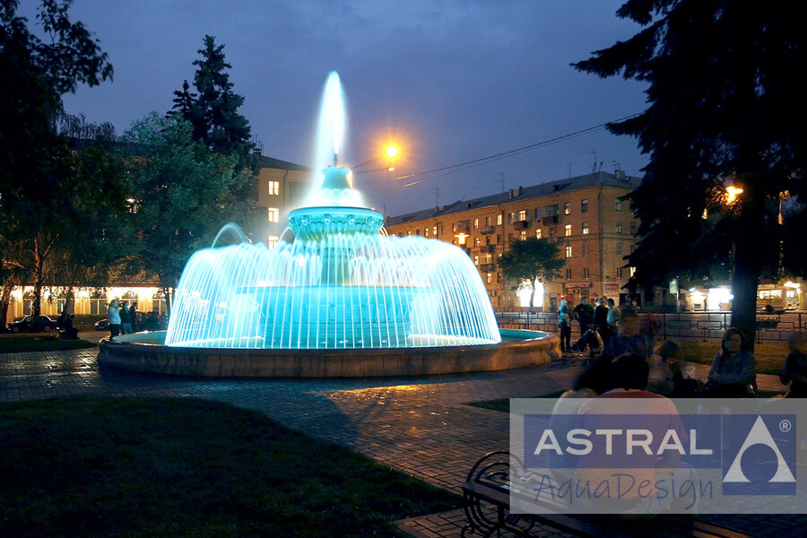 На площади перед липецким домом культуры НЛМК, при активном участии наших сотрудников, был построен классический фонтан с круглой белоснежной чашей. Он имеет три уровня. На самом нижнем расположен ряд струй, образованных кольцевой насадкой, и сходящихся к центру. Далее идет чаша с переливом. А скульптурный ансамбль в сочетании с пенной струей венчает всю композицию. Девяносто светильников подсвечивают струи в темное время, создавая незабываемую водную картину.