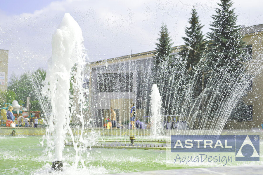 Фонтан с двойной квадратной чашей был построе на центральной площади города Чайковский в Пермском крае. При разработке проекта, наши специалисты учли пожелания заказчика - сделать необычную композицию, при этом не используя большого количества насадок. Это получилось реализовать благодаря тому, что угол наклона форунок в кольцевых насадках легко регулируется. Поэтому можно добиться создания интересных водных эффектов. Например в данном проекте струи направлены от центра, что привносит ощущение новизны. Пенные насадки создающие пышные струи добавляют динамики композиции.