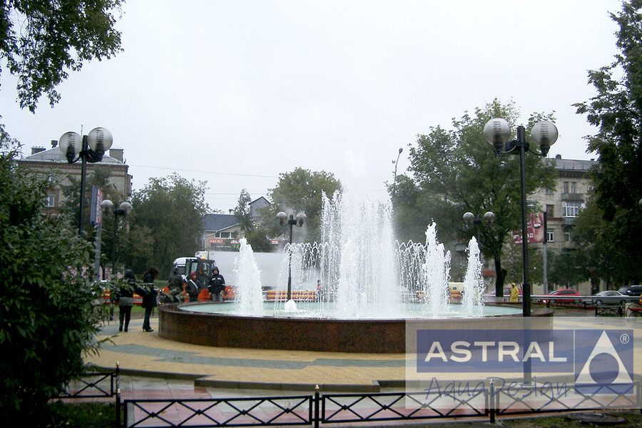 Цветодинамический фонтан с круглой чашей, был построен на площади перед кинотеатром в г. Люберцы. Несколько насадок, включая кольцевые и пенные, создают разнообразную водную картину. А новые быстродействующие насосы, установленные согласно разработанному нами проекту, обеспечивают быструю смену водных картин.