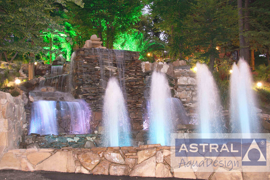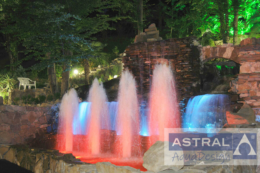 Фонтанный комплекс с фонтанами и водопадами, был спроектирован и построен нашими сотрудниками для санатория в Сочи. Водный рисунок образут пенные насадки установленные у подножия искусственных водопадов. Яркие светильники подсвечивают струи и изливы.