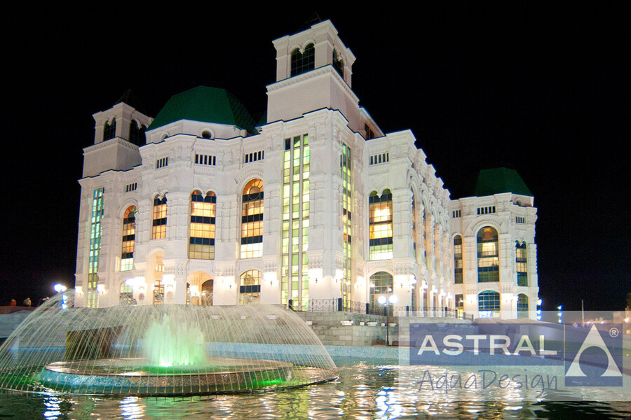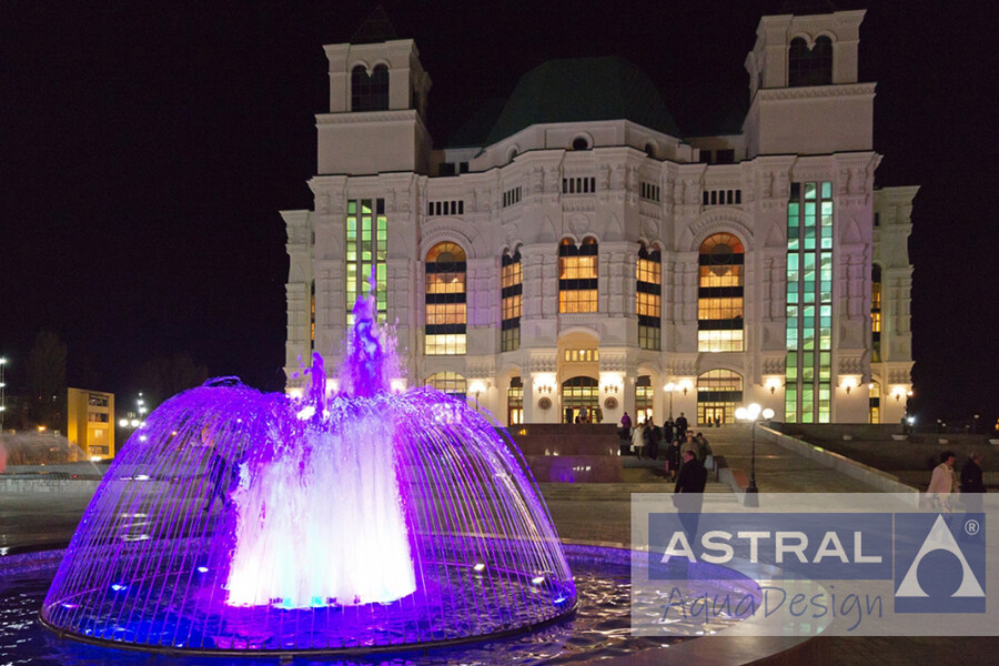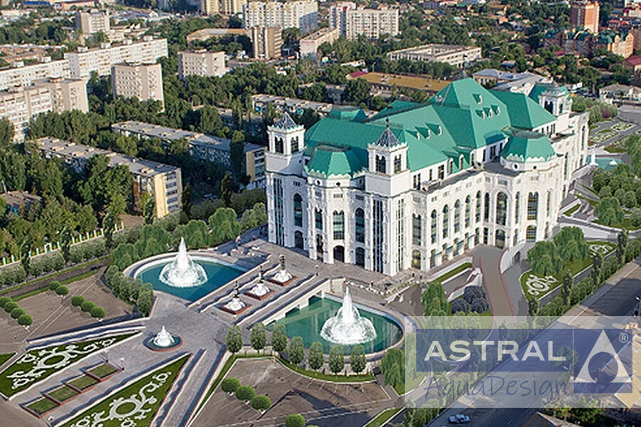 Фонтанный комплекс, построенный на площади перед музыкальным театром в Астрахани стал одним из главных ее украшений. Реализация проекта велась при участии наших специалистов совмествно с компанией «Милайт». Композиция из трех цветодинамических фонтанов органично сочетается с дизайном самой площади и оформлением фасада здания театра. Два больших водных объекта располагаются по бокам от в хода, а третий в центре площади. Их габариты от 10 до 20 метров соответственно.