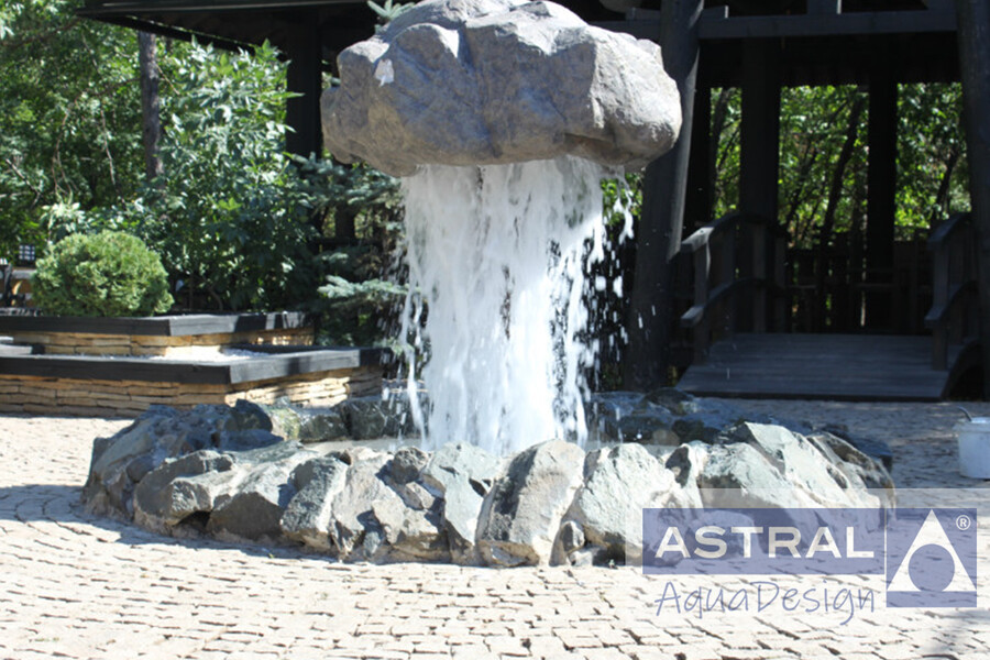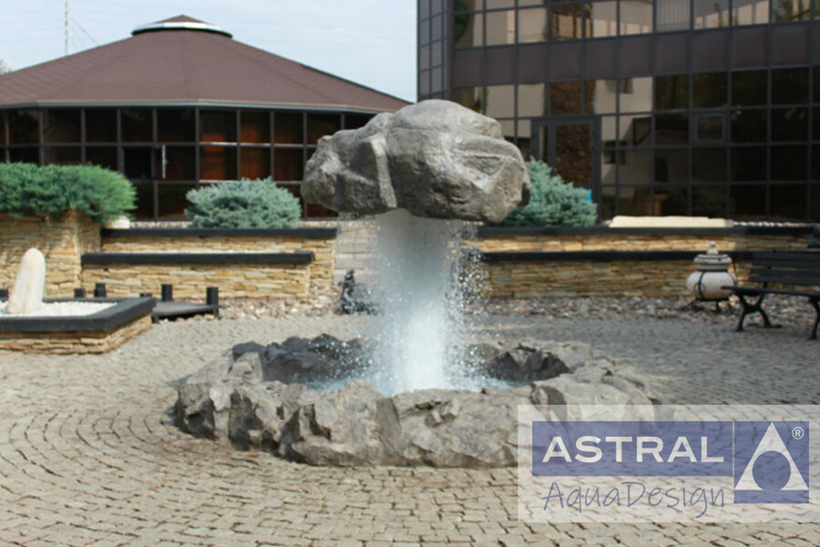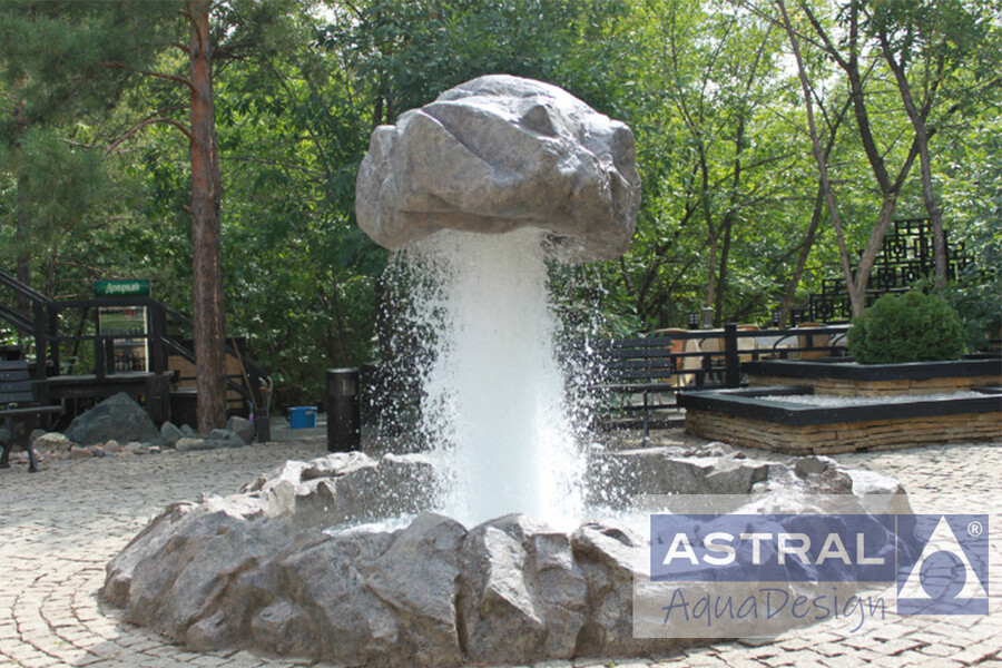 В Оренбурге открылся новый японский ресторан. Он имеет внутренний двор выполненный в традиционном стиле. Поэтому, когда было принято решение построить фонтан на территории ресторана, владельцы выбрали нестандатный водный объект - парящий камень. Круглая чаша обрамленная валунами имеет диаметр 4 метра, а высота композиции достигает 2,5 метров.