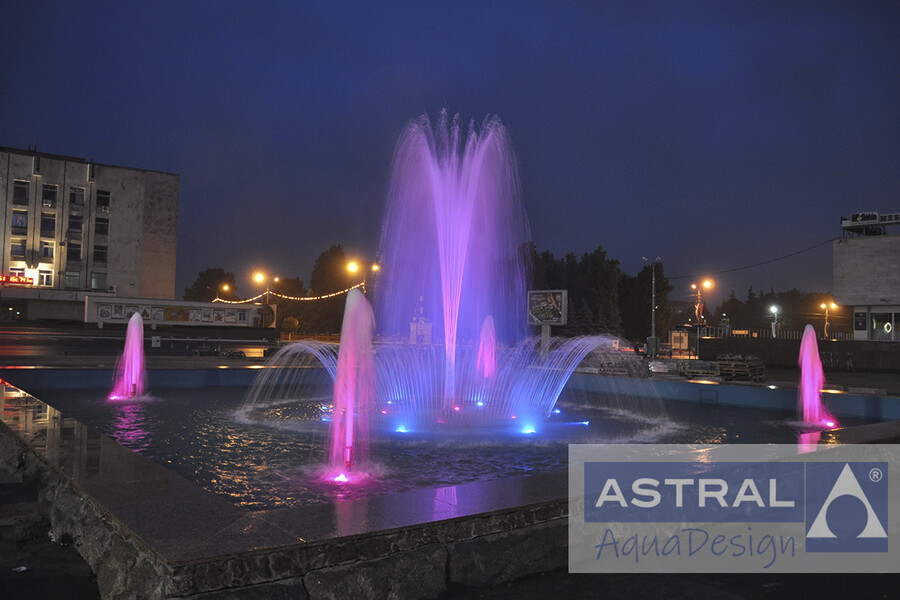 Теперь водную картину образуют четыре пенные насадки, одна многоструйная, а также кольцевая насадка создающая ряд параболических струй направленных к бортам чаши. RGB светильники создают яркую подсветку струй в вечернее время.