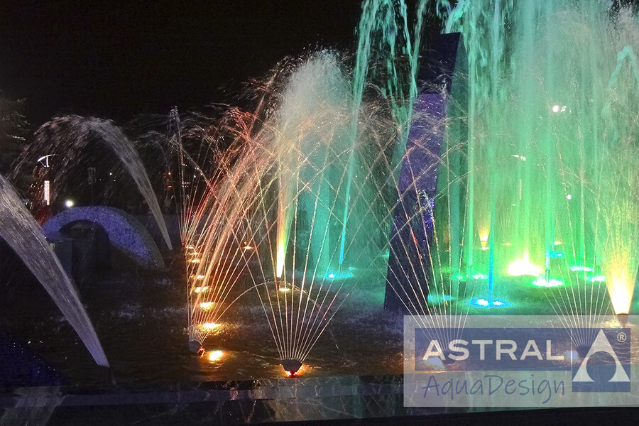 Необычную скульптурную композицию великолепно дополняют различные виды насадок: одноструйные, многоструйные, веерные и пенные. Каждая из них оборудована мощными RGB светильниками, раскрашивающими фонтан в яркие цвета в вечернее время. Габариты квадратной чаши 30х30 метров.