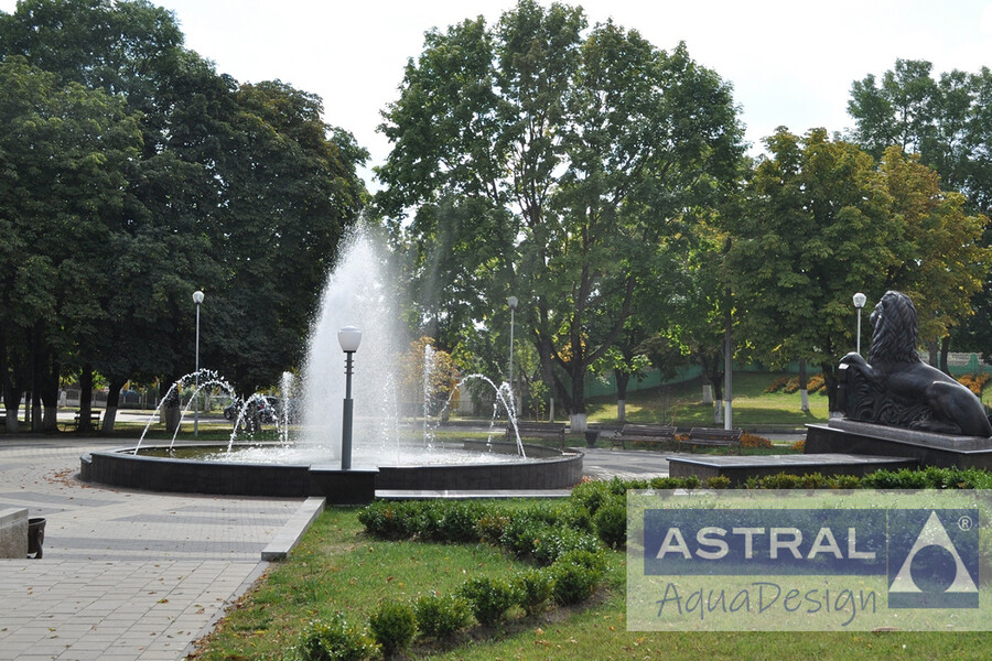 В парке белорусского города Несвиж, где находится один из самых живописных замков, был построен фонтан. По краям круглой чаши расположен ряд одиночных параболических струй сходящихся к центру где установлена пенная насадка создающая очень пышную струю.