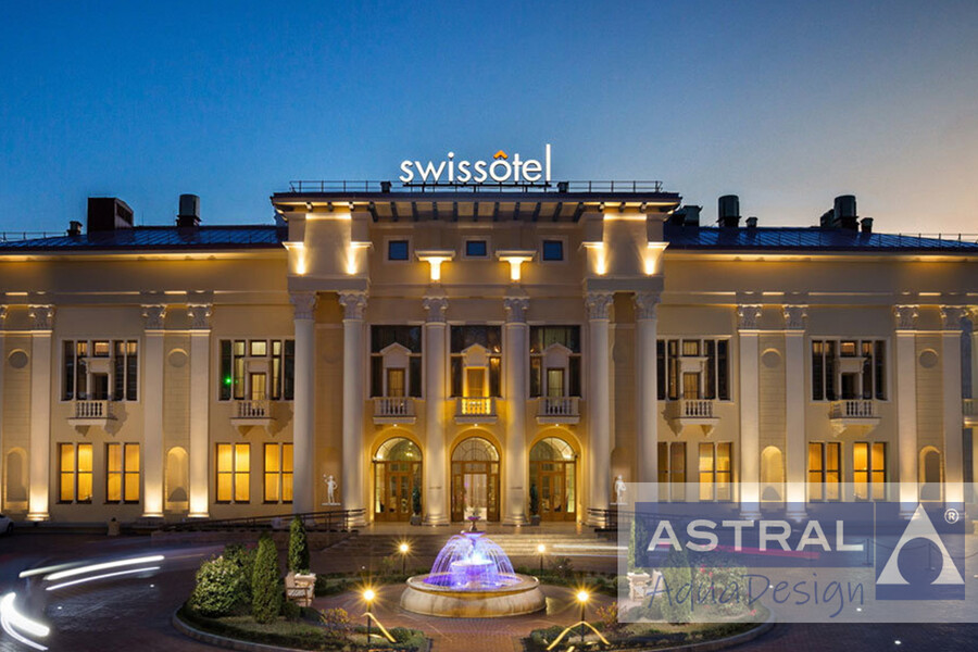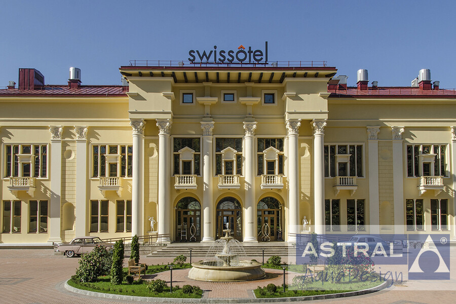 Строительство фонтана перед отелем всегда положительно влияет на его имидж, особенно если это классический чашный фонтан, идеально сочетающийся с дизайном фасада. Подобный тому, который теперь украшает главный вход отеля Swiss Hotel в Сочи. Параболические струи, сходящиеся к центральной композиции с переливами, создают ощущение целостности объекта. Чаша диаметром 3,5 метра облицована материалом напоминающим песчаник. Такой ход позволяет сохранить массивную конструкцию легкой.