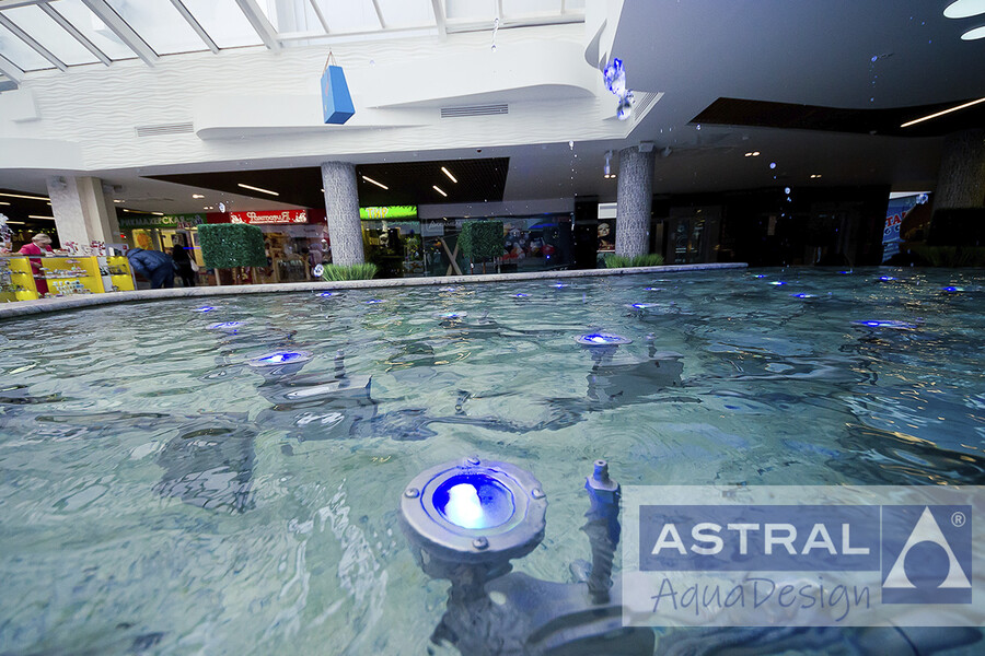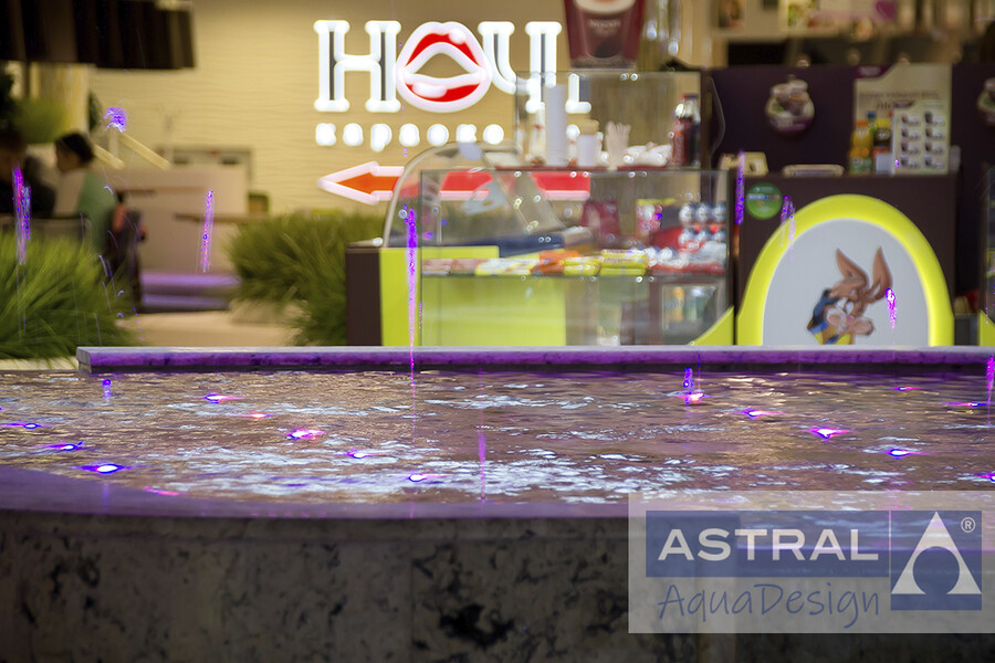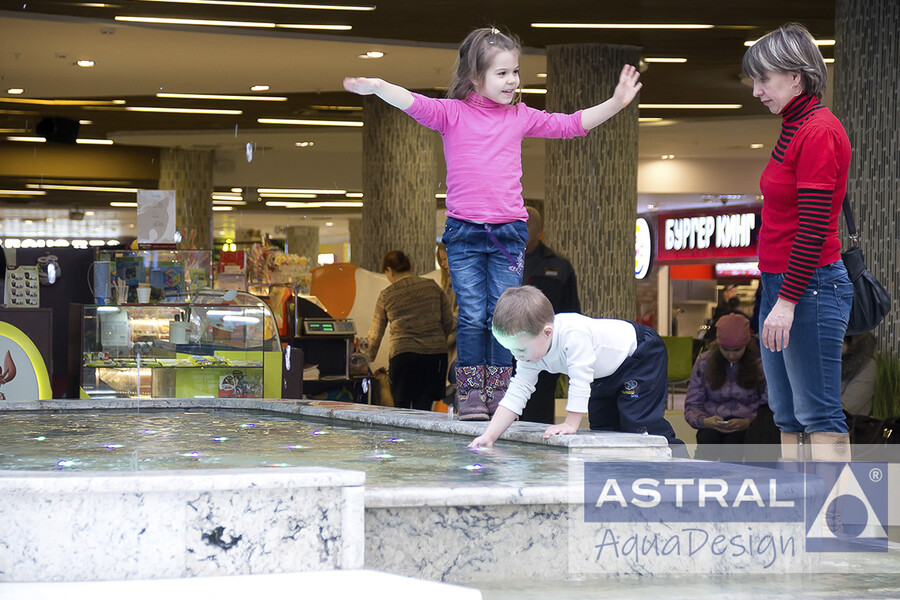 Оригинальный фонтан украсил территорию рядом с ресторанным двориком в торговом центре в Белгороде. Его изюминкой является полное отсутствие струй в привычном нам понимании. Вместо них водную картину создают множество капель выпрыгиюващих из воды. Их создают специальные насадки которые "выстреливают" воду через равные промежутки времени.