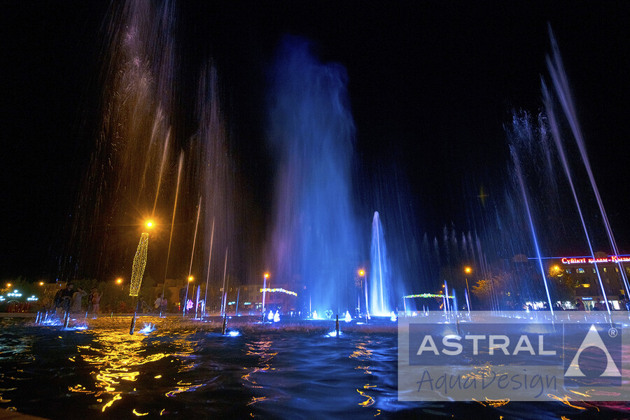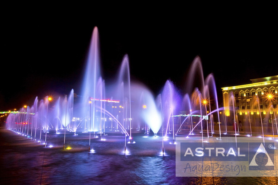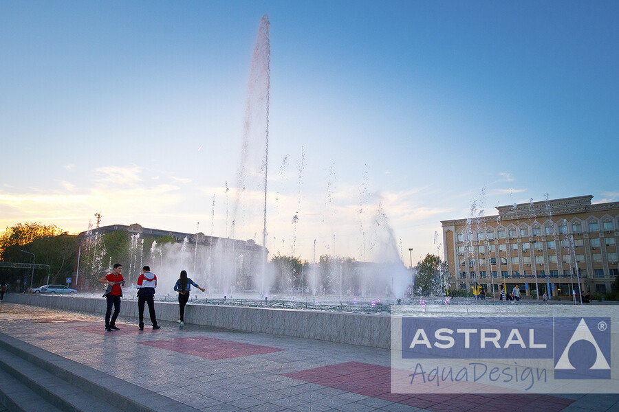 Яркий цветомузыкальный фонтан с прямоугольной чашей органично вписался в пространство городской площади перед университетом в Кызыл-Орде (Казахстан). Ее габариты 20х40 метров. Водную картину создают 127 различных фонтанных насадок: одноструйные, многоструйные, туманные, качающиеся, ротационные и пенные.