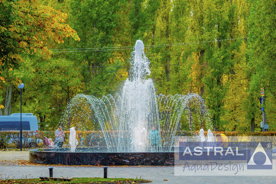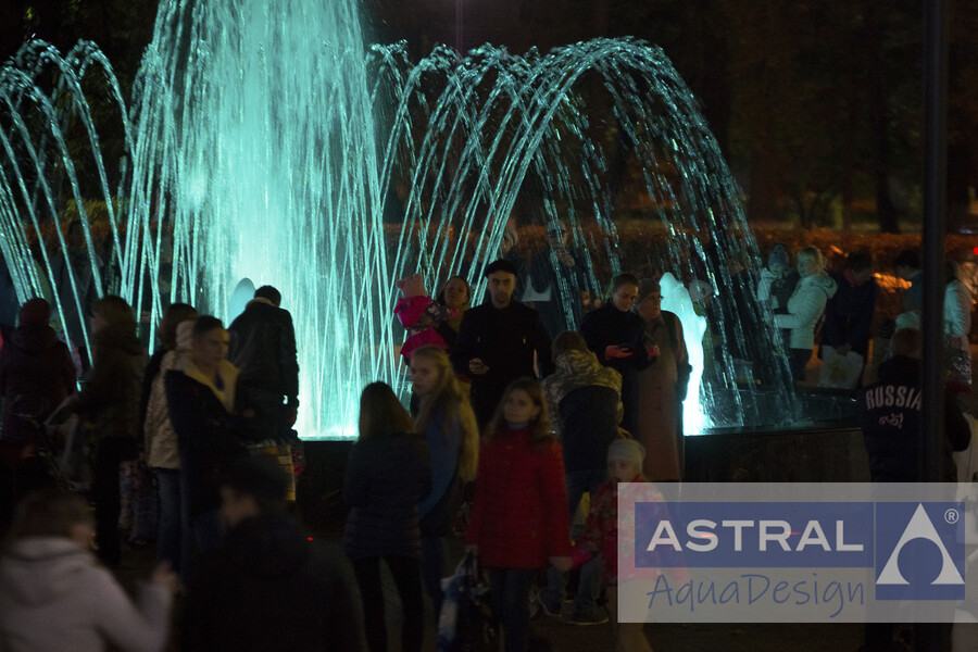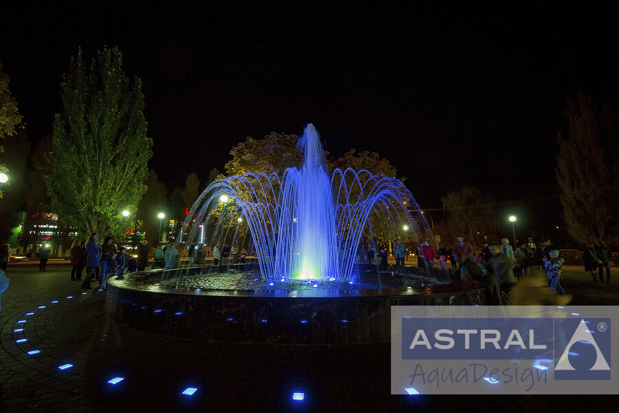 Цветодинамический фонтан с круглой чашей был построен при участии наших сотрудников в Балаково (Саратовской области). Диаметр чаши - 6 метров. Водную композицию создают две кольцевые насадки и одна пенная. Высота центральной пенной струи может достигать 5 метров. Вечером включается подсветка созданная мощными но экономичными RGB светильниками.