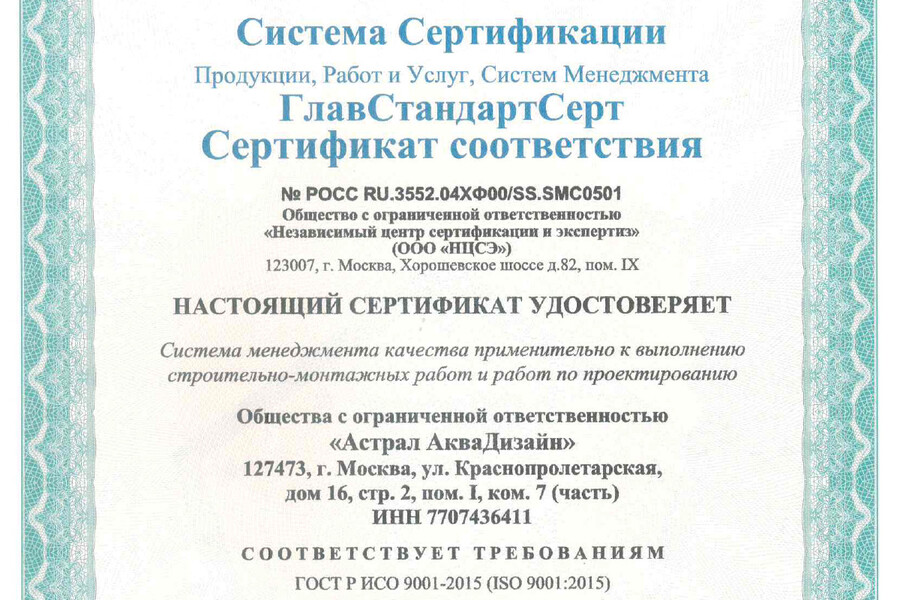 Рады сообщить, что про результатам аудита проведенного компанией ГлавСтандартСерт, система менеджмента качества применительно к выполнению строительно-монтажных работ и работ по проектированию в нашей компании соттветствует требованиям ГОСТ Р ИСО 9001-2015 (ISO 9001:2015)