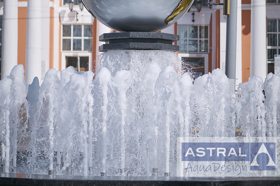 Фонтан отличает насыщенная водная картина. Три динамических контура из 48 пенных струй дополняет фонтанное кольцо со 150-ю одноструйными насадками. Центральная скульптурная композиция, выполнена в технике «парящий шар». Она будет украшать площадь и в зимнее время, когда объект будет законсервирован.