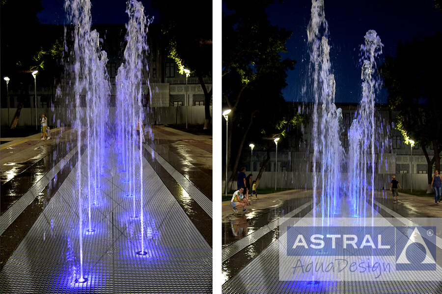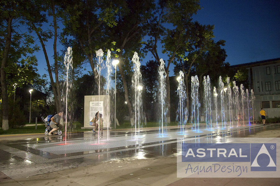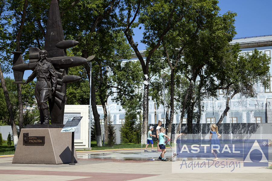 На территории Летного городка в Энгельсе (Саратовская область), по инициативе местных властей, был благоустроен сквер Дальней авиации. Теперь его украшает памятник знаменитой летчице Марине Расковой, а позади него установлен цветодинамический пешеходный фонтан. Он может работать как в динамическом так и в статическом режимах. Высота струй может достигать 3 метров в высоту. Вечером включается яркая подсветка созданная экономичными RGB светильниками. Прямоугольная чаша размером: 22 х 4 метра облицована полимерной решеткой и гранитными плитами.