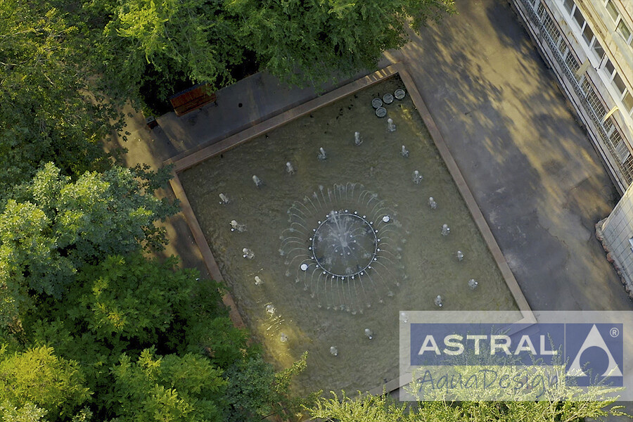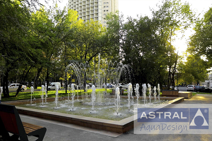 Классический фонтан с квадратной чашей простроен на улице Курмангазы в г. Алматы. Запуск состоялся в августе 2021 года.
