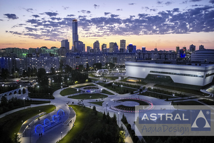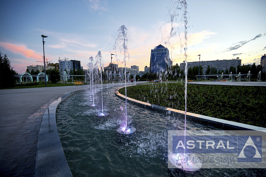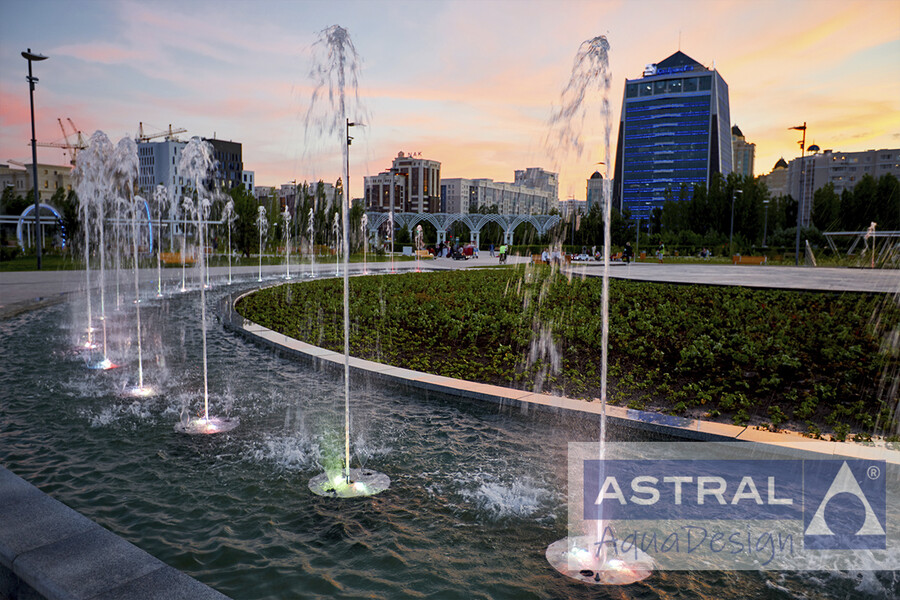Классический фонтан простроен напротив Центра Назарбаева в Нур-Султане (Казахстан). Чаша представляет собой неполный круг. Ее дополняют клумба и подиум. По всему периметру установлено 56 форсунок SPEAR NOZZLE из нержавеющей стали. Они создают ряд струй достигающих высоты 4 метра. Их дополняют 112 форсунок Spraying jet 3/8”. Подсветка фонтана выполняется при помощи 112 подводных LED светильников RGB+W, управляемых по протоколу DMX. Они могут создавать более 16.000.000 цветовых оттенков.