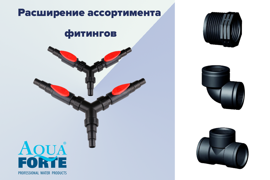 Рады сообщить о расширении ассортимента товаров AquaForte по фитингам. В каталог добавились новые группы товаров для монтажа прудового оборудования, такие как: ниппели, муфты, футорки, угловые соединения, тройники, переходники, делители потока и много другое.