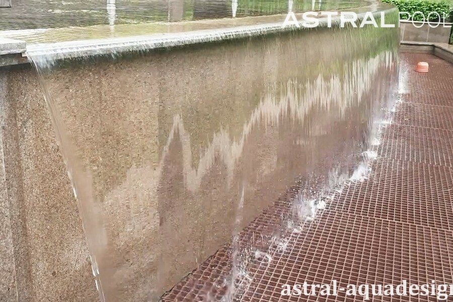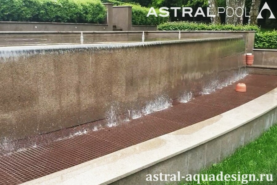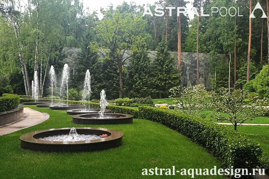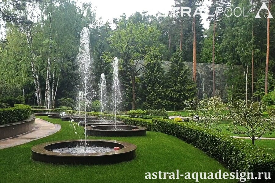 Фонтанный комплекс, состоящий из 7 водных объектов реконструирован в Подмосковье. Шесть небольших фонтанов с круглыми чашами органично вписаны в ландшафтную композицию. В каждой установлено по одной насадке, которая создает высокую струю, которая динамично меняет высоту. Еще один фонтан - представляет собой чашу с переливом и четырьмя струями.