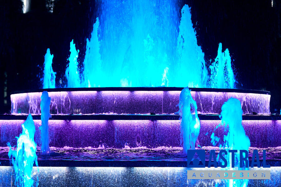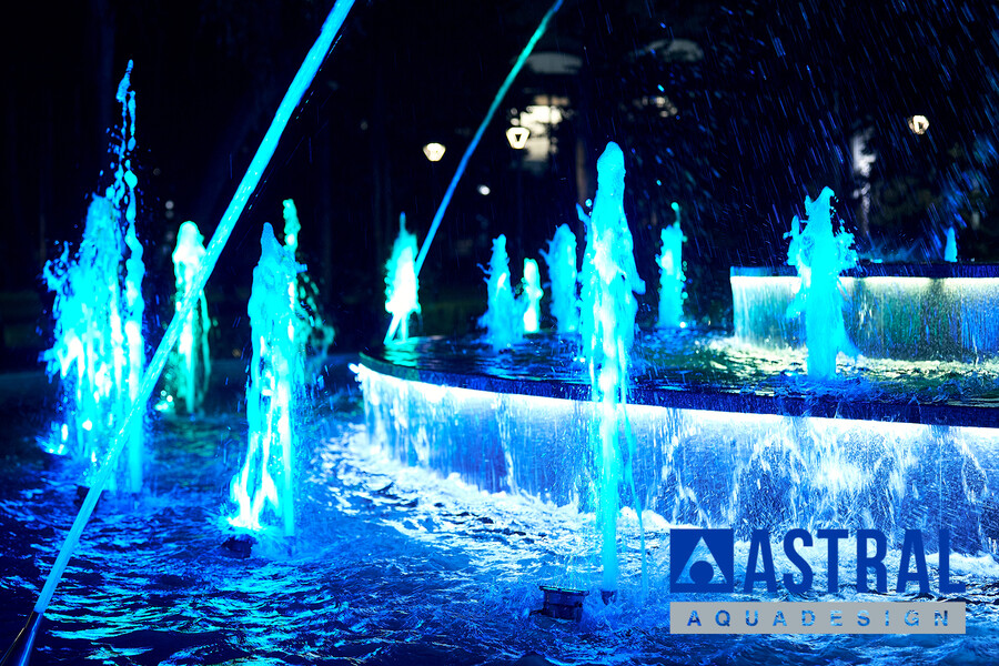 Водную картину создают пенные струи типа Cascade Nozzle трех типоразмеров в количестве 85 шт. и мощные водные арки. Фонтанные струи управляются группами и подсвечиваются светодиодными RGBW DMX светильниками. Высота центральной струи 7 метров, диаметр фонтана - более 20 метров. Для подсветки периметра чаши была применена светодиодная лента.